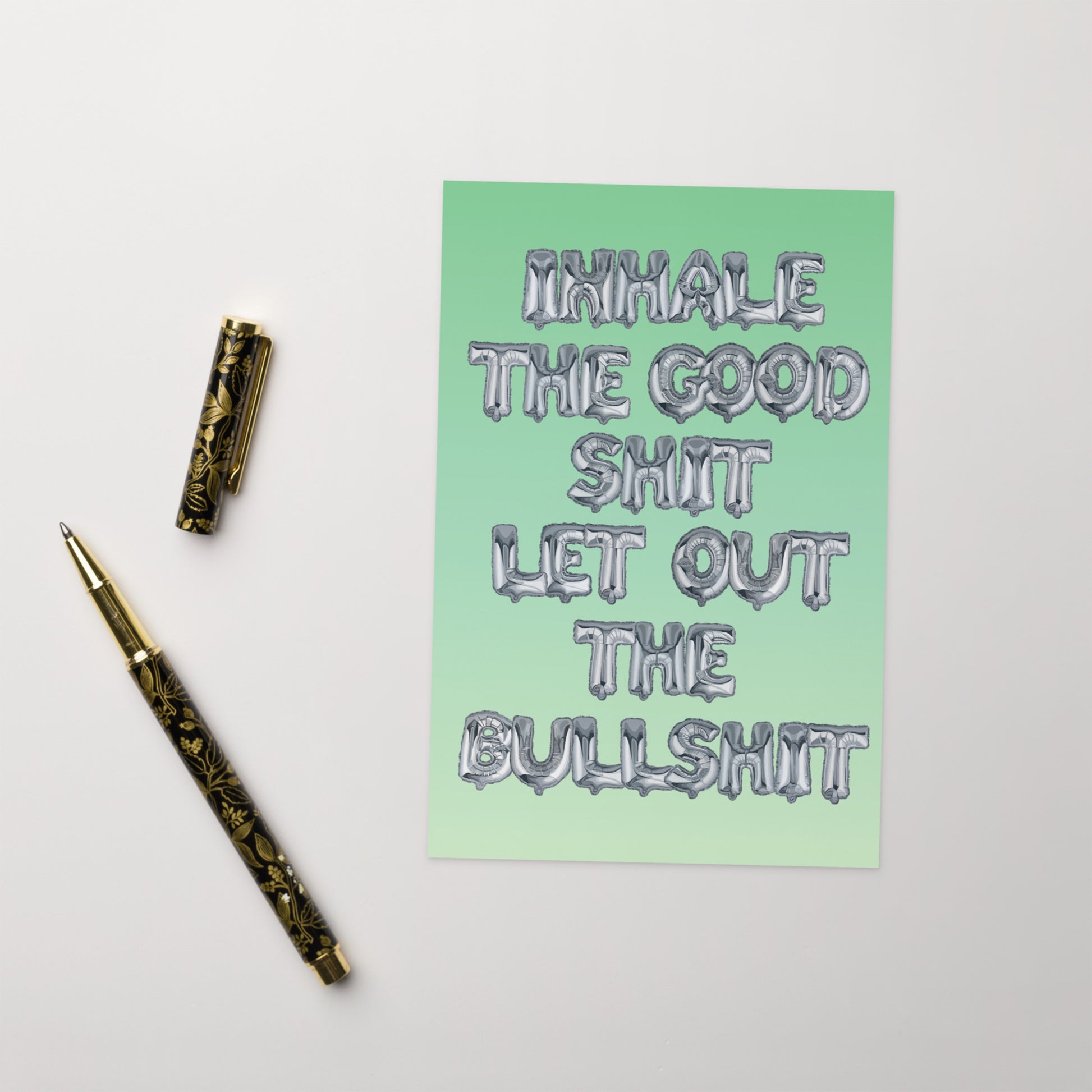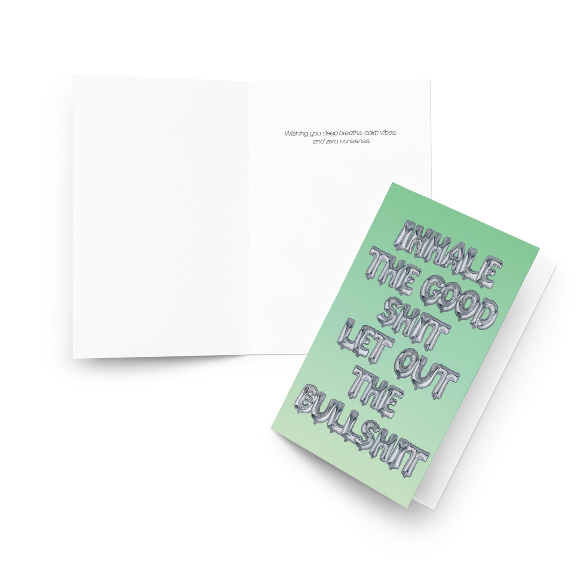 A chill, uplifting card featuring KB The Human’s signature hand painted silver balloon lettering. Set against a serene gradient, the message inside—"Wishing you deep breaths, calm vibes, and zero nonsense"—makes it the perfect pick for anyone who needs a little peace (and a lot less drama).